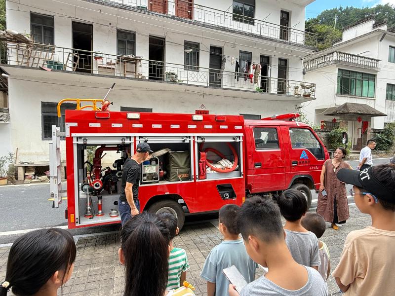实操环节中,活动聚焦“学用结合”设置两大模块:乡应急管理办工作人员现场演示救生衣规范穿戴流程,详解卡扣固定、浮力原理及“穿、调、查”三步法,并邀请青少年上台实操体验;消防救援人员同步开展消防车装备展示与使用讲解,通过器材功能演示、应急操作示范,帮助参与者掌握火灾初期处置与逃生自救技能。村民代表表示,活动内容实用、形式新颖,有效提升了家庭安全防护意识。