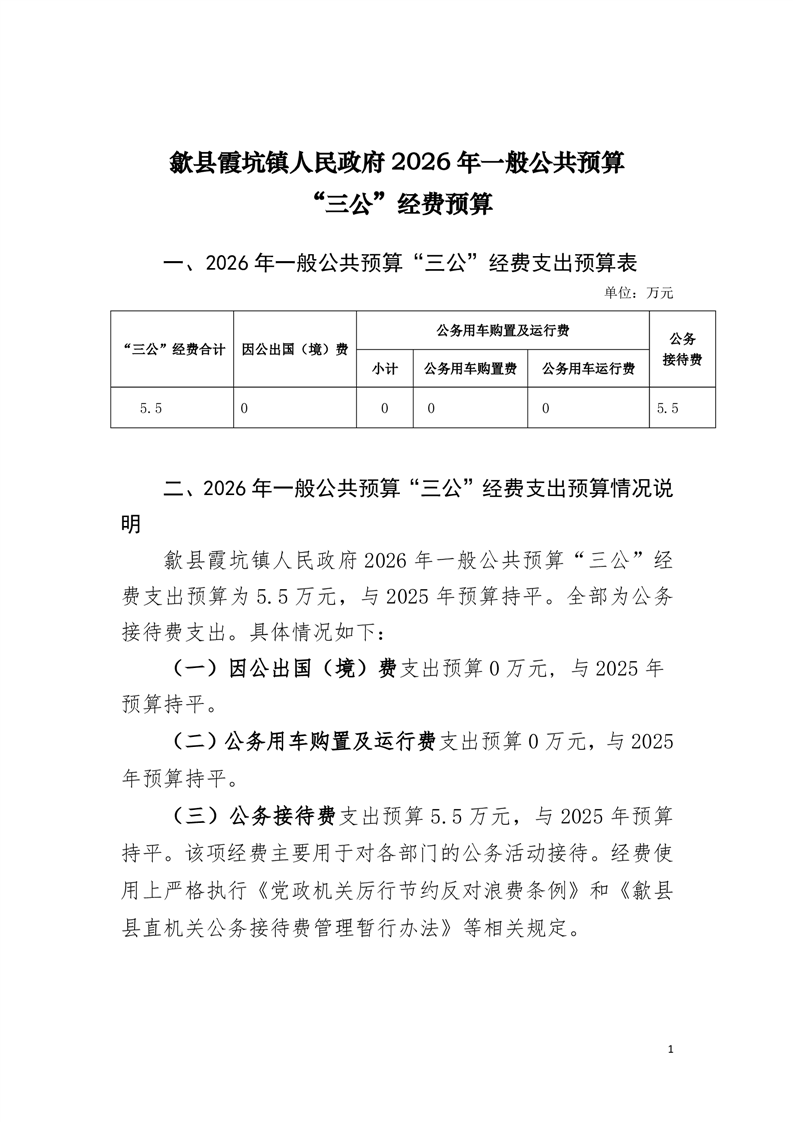 歙县霞坑镇人民政府2026年三公经费预算公开