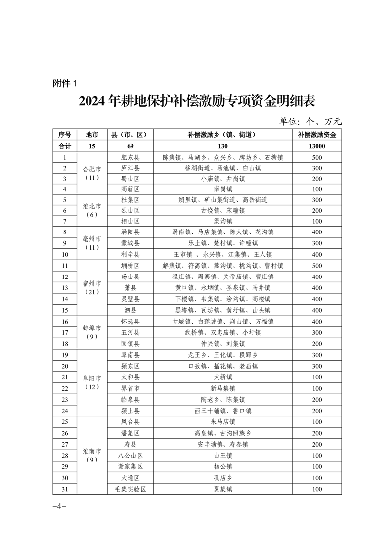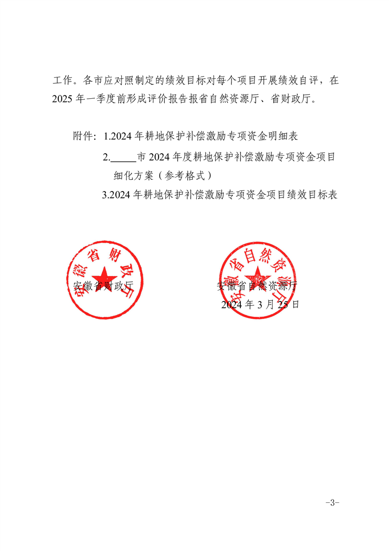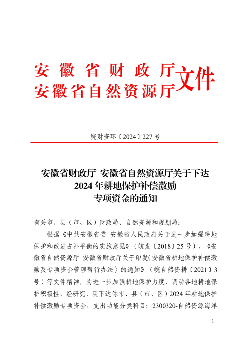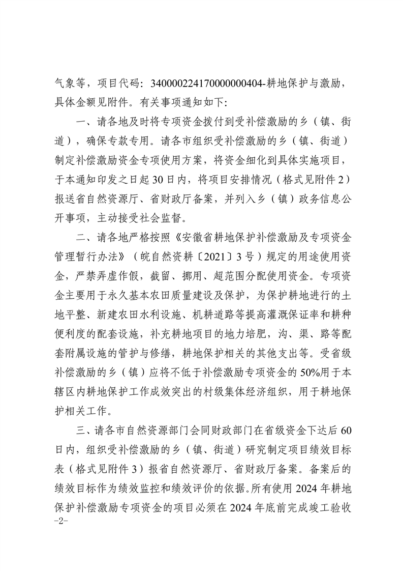 安徽省财政厅 安徽省自然资源厅关于下达2024年耕地保护补偿激励专项资金的通知