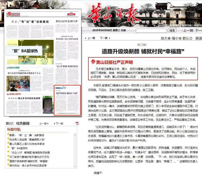 近日,歙县街口镇滩头村焕然一新的新小公路跃入眼帘,沥青路面泛着光泽,反光标识醒目亮眼。不远处,王街公路改造现场机械轰鸣,施工正酣。两条被列为“头号民心工程”的主干道,一条已成“民生动脉”,一条正升级为“振兴引擎”,共同铺就山区乡镇发展的“快车道”。