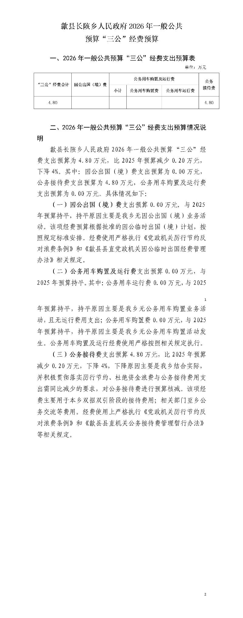 歙县长陔乡人民政府2026年度一般公共预算“三公”经费预算
