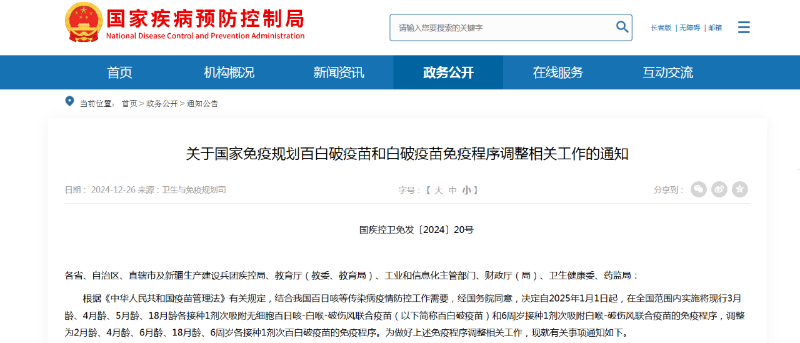 本次调整接种程序的疫苗是吸附无细胞百日咳-白喉-破伤风联合疫苗(以下简称百白破疫苗),用于预防百日咳、白喉、破伤风,属于国家免疫规划疫苗,为适龄儿童免费接种。近年来,全球和我国百日咳疫情回升,我国小月龄婴儿和学龄儿童发病风险有所升高。为进一步加强对小月龄婴儿和学龄儿童的免疫保护,国家多部门联合印发《关于国家免疫规划百白破疫苗和白破疫苗免疫程序调整相关工作的通知》,决定自2025年1月1日起,在全国范围内,调整百白破疫苗的免疫程序。
