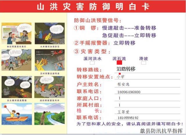 立即转移:将信息及时通知到所有村干部、格长、危险区内住户和有关单位;提前转移老弱病残等人员及沿河人员,根据降雨情况和上级命令逐步转移其他受威胁区域人员。