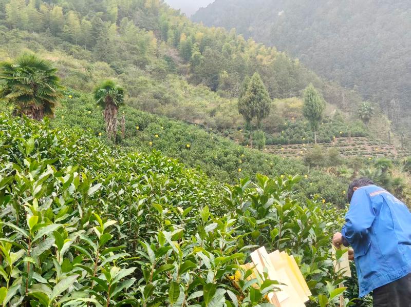 绿色防控全覆盖,筑牢茶园生态屏障。为从源头保障春茶品质,狮石乡全面推进茶园病虫害绿色防控行动,坚决摒弃粗放化学防治,依托物理手段守护茶叶原生态。乡农技人员、“村小二”志愿者下沉茶园一线,现场示范指导茶农科学把控粘虫黄板间距、悬挂高度与布设数量,严格按照每亩40块的标准规范扦插,实现全乡茶园物理防控无死角、全覆盖,为春茶优质高产打下坚实基础。