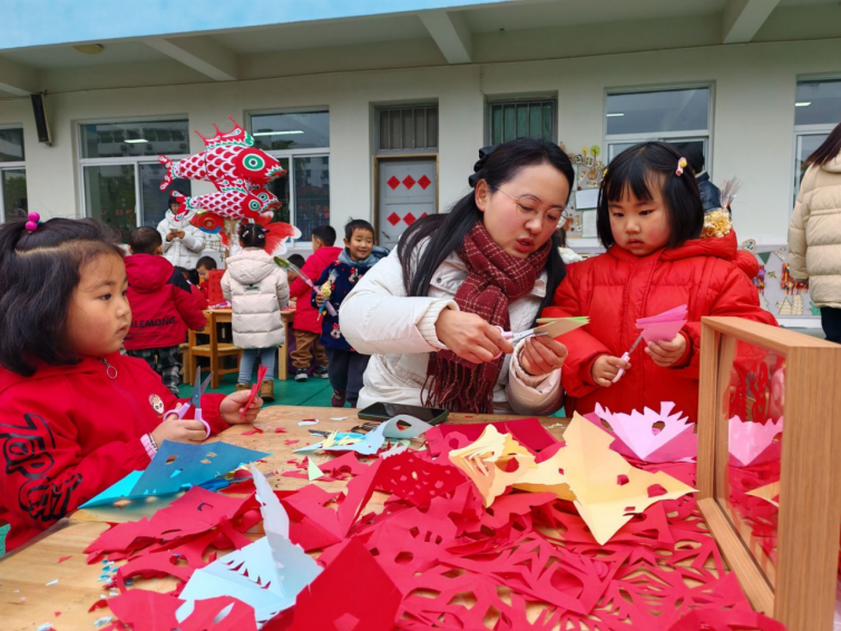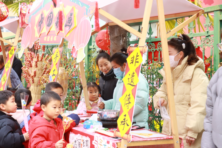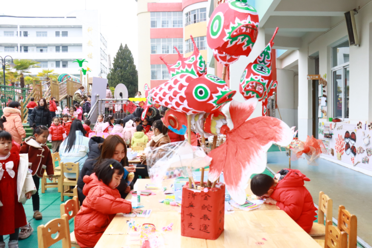 活动当天,三大区域轮番上演欢乐篇章。年货加工坊里热闹非凡,孩子们在家长导师的协助下分工协作,小班包装糖果、搓汤圆;中班拓印年画,在非遗传承人的悉心指导下给鱼灯上色;大班跟着非遗传承人学习剪纸技艺、制作花束、书写福字,用劳动赚取“小松币”,既体会付出与收获的快乐,又近距离感受非遗文化的独特魅力。年味区中,孩子们用亲手挣来的“小松币”兑换心仪的美食,酸甜的糖葫芦、软糯的汤圆、地道的徽墨酥,每一口都是舌尖上的年味;年俗区里,套圈、学说家乡话、舞龙舞鱼灯等互动项目精彩纷呈,稚嫩的欢笑声弥漫校园。