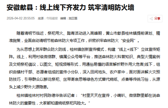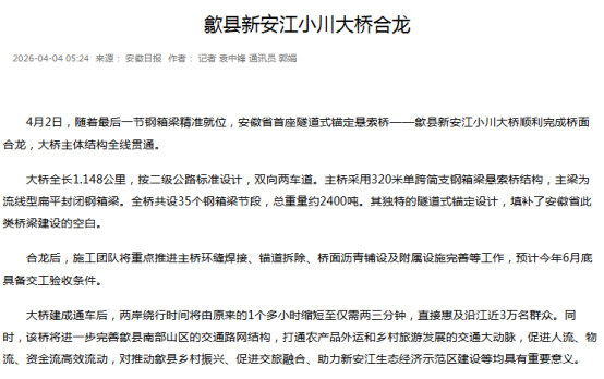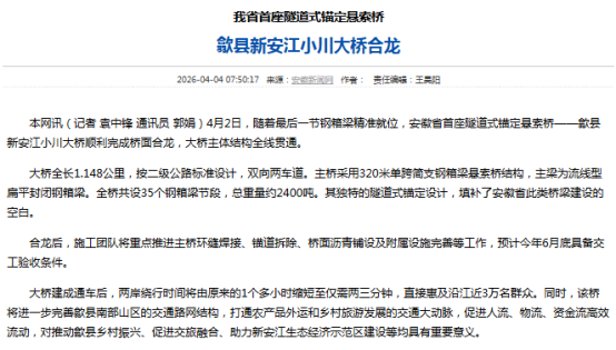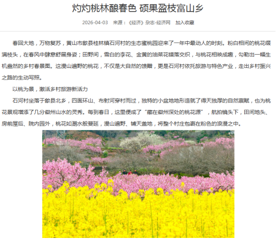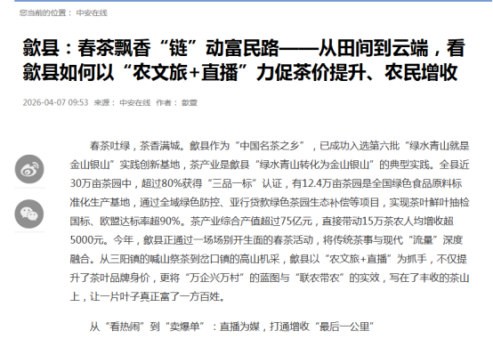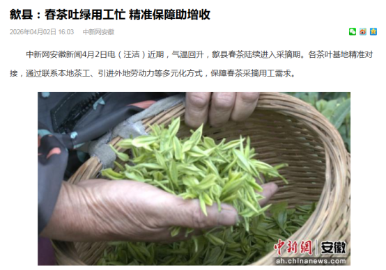 当前正值春茶采摘、特色农产品上市、重点产业项目建设等关键节点,歙县坚持生态优先,绿色发展,以生态赋能产业提质,以产业反哺生态保护。人民日报刊发清凉峰保护站站长王山青先进事迹,生动诠释“守好这座山、护好这片绿”的坚守与担当。央视农业农村频道播出《新品种+新技术 鳜鱼养殖不再靠天吃饭》,关注鳜鱼良种繁育与技术创新。经济日报推出《灼灼桃林酿春色 硕果盈枝富山乡》。安徽卫视、安徽日报高度关注工程进程,先后刊播《歙县新安江小川大桥合龙》《我省首座隧道式锚定悬索桥合龙》。此外,《歙县:春茶吐绿用工忙 精准保障助增收》《歙县经开区:精准搭建供需桥梁 做实做优用工服务》《歙县:“妈妈岗”巧解用工难与带娃难》等多篇报道在中国新闻网、中安在线、安徽经济报等省级媒体平台刊发,全面展现稳就业、保用工、优服务的务实举措。