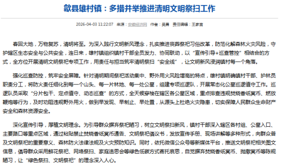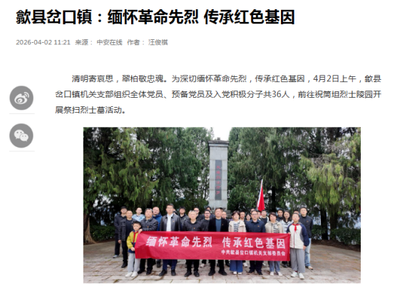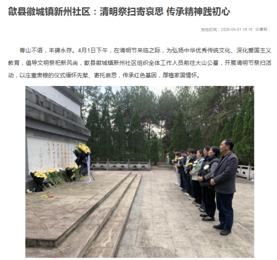 依托清明节点,大力倡导文明祭扫、绿色祭扫,全县各地广泛开展缅怀革命先烈、红色基因传承、廉洁文化建设等主题活动。相关报道在央广网、新安晚报、香港商报等媒体刊发。