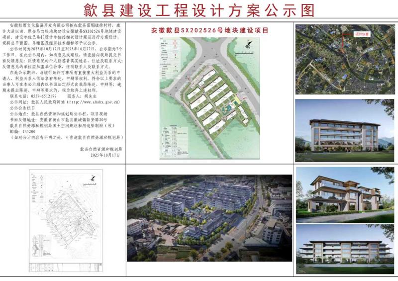 安徽桂雨文化旅游开发有限公司拟在歙县富堨镇徐村村,城许大道以南,原金马驾校地块建设安徽歙县SX202526号地块建设项目。建设单位已委托设计单位按相关设计规范进行方案设计,现将总平面图、鸟瞰图及经济技术指标等予以公示。