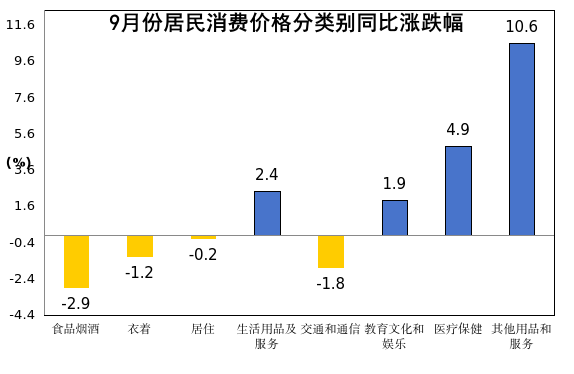 其他七大类价格同比四涨三降。其中,其他用品和服务价格上涨10.6%,医疗保健价格上涨4.9%,生活用品及服务价格上涨2.4%,教育文化和娱乐价格上涨1.9%,交通和通信价格下降1.8%,衣着价格下降1.2%,居住价格下降0.2%。