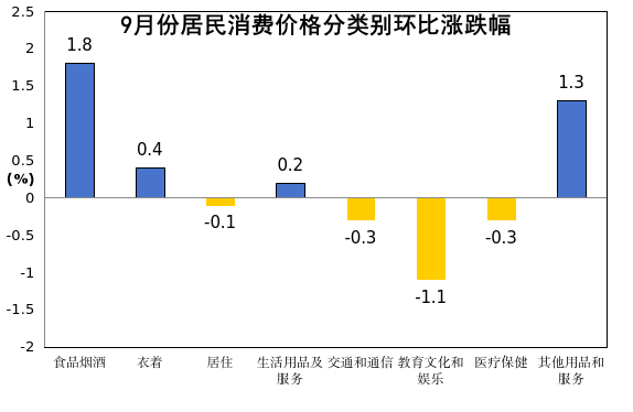 其他七大类价格环比三涨四降。其中,其他用品和服务价格上涨1.3%,衣着价格上涨0.4%,生活用品及服务价格上涨0.2%,教育文化和娱乐价格下降1.1%,交通和通信价格下降0.3%,医疗保健价格下降0.3%,居住价格下降0.1%。