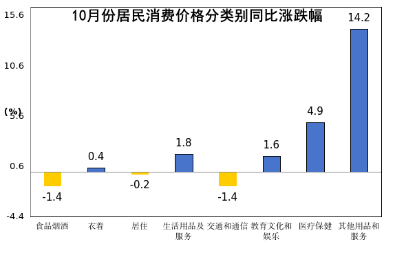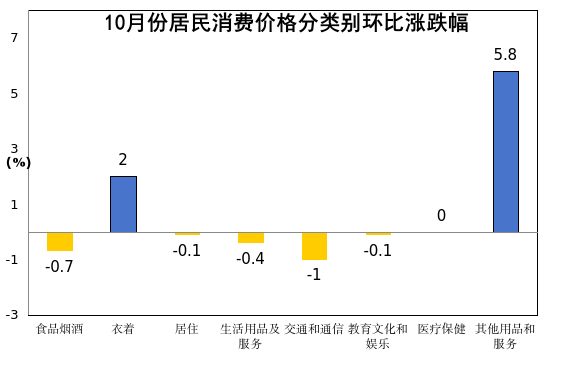 其他七大类价格同比五涨二降。其中,其他用品和服务价格上涨14.2%,医疗保健价格上涨4.9%,生活用品及服务价格上涨1.8%,教育文化和娱乐价格上涨1.6%,衣着价格上涨0.4%,交通和通信价格下降1.4%,居住价格下降0.2%。