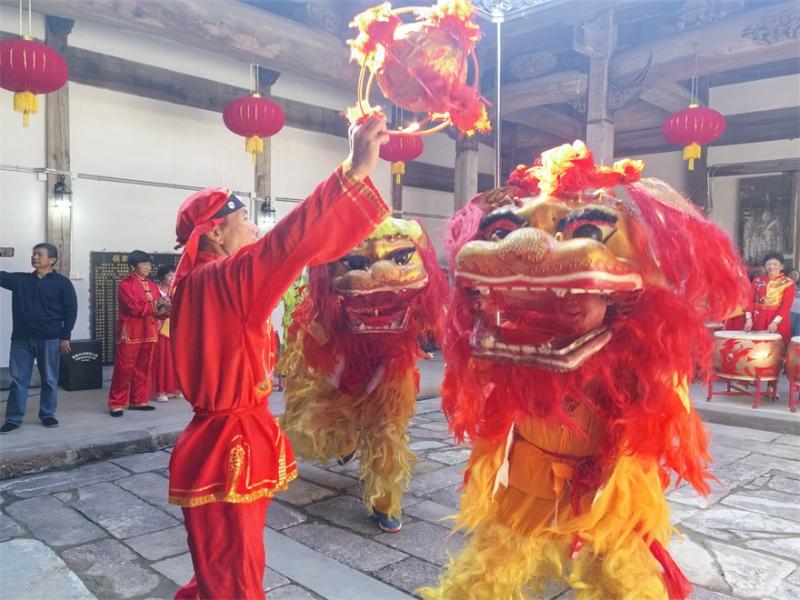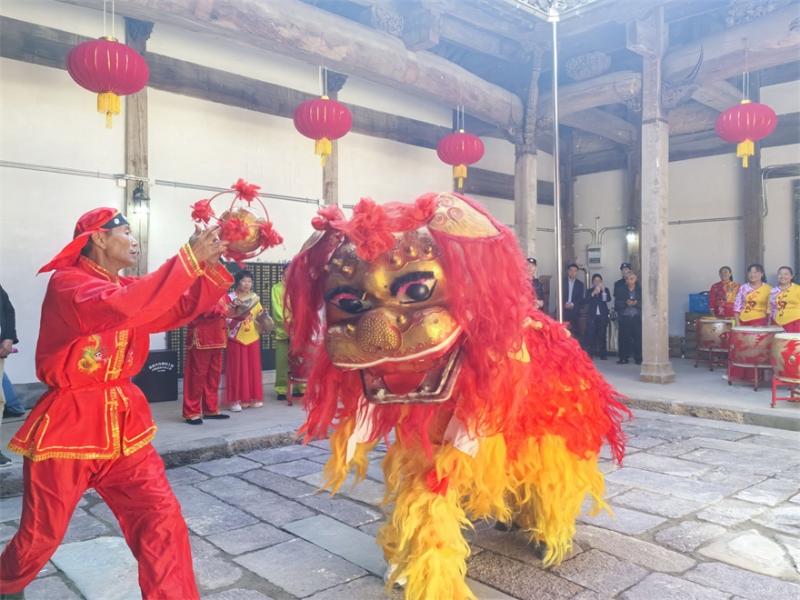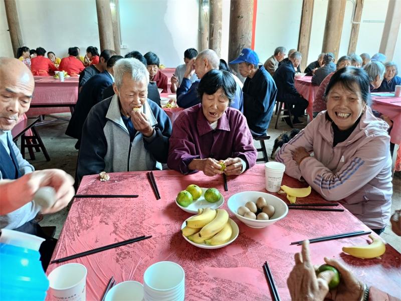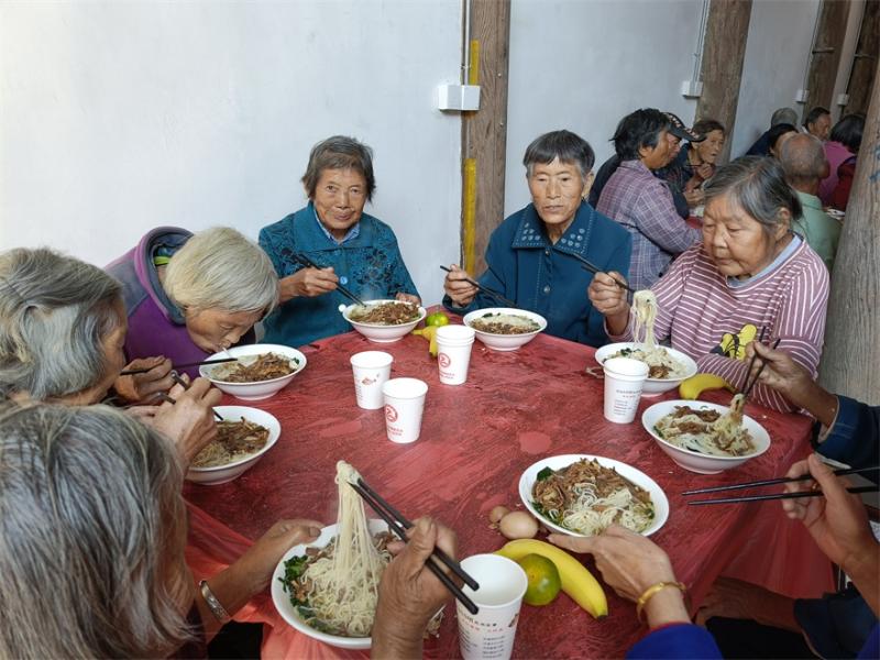 随着锣鼓点声,雄狮起舞,“九九重阳宴”正式开始。一份份果盘、一碗碗长寿面端上餐桌,透出浓浓烟火气。村内百余位老人高兴地围坐在一起,一边品尝着美味,一边追忆往昔,从舌尖到心间都洋溢着欢乐与幸福。