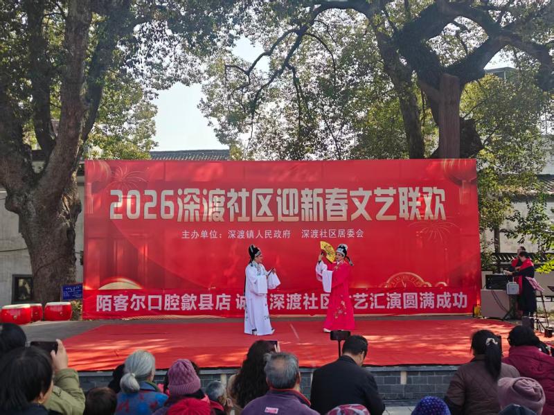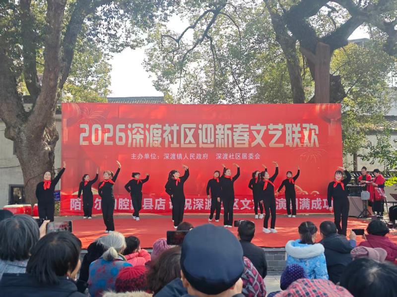 2月11日下午,暖阳透过深渡社区樟树广场的香樟枝叶,在青石板上洒下斑驳光影,2026年迎新春文艺联欢汇演热闹开演。这场由社区居委会主办的“家门口春晚”,不仅是一场年味十足的文化盛宴,更是深渡镇以文塑旅、以旅彰文,推动文旅融合发展的生动缩影。