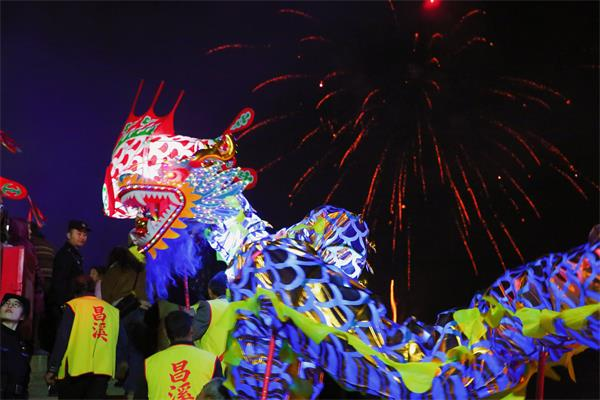 舞龙灯将氛围推向高潮。金龙通体流光,鳞片熠熠生辉,舞龙队员步伐整齐、动作矫健,龙身盘旋腾跃、穿梭起伏,时而直冲云霄、时而蜿蜒前行,锣鼓喧天、鞭炮齐鸣,象征着昌溪乡蒸蒸日上、龙腾虎跃的新气象,承载着驱邪避灾、迎福纳祥的美好寓意。