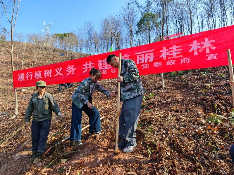 活动现场,彩旗飘扬,干劲十足。桂林镇党员干部们精神饱满,迅速投入到植树劳动中。大家分工协作、配合默契,挥锹铲土、扶苗培土、踩实夯苗、提水浇灌,每一道工序都一丝不苟。一个个红马甲在绿意映衬下格外醒目,生动展现了基层党员干部冲锋在前、实干担当的良好风貌。据了解,本次植树行动兼顾生态效益与景观效果,技术人员全程现场指导种植与管护要点。经过一上午的辛勤劳作,新栽的树苗错落挺立、迎风舒展,为初春的桂林大地注入了蓬勃生机。“义务植树既是责任,更是义务。”参与活动的党员干部表示,将以此次活动为契机,牢固树立“绿水青山就是金山银山”理念,不仅在行动上栽绿植绿,更在工作中践行绿色发展要求,扎实推进乡镇生态保护、人居环境整治等工作,同时积极向群众宣传植绿护绿知识,带动更多人参与到生态建设中来。