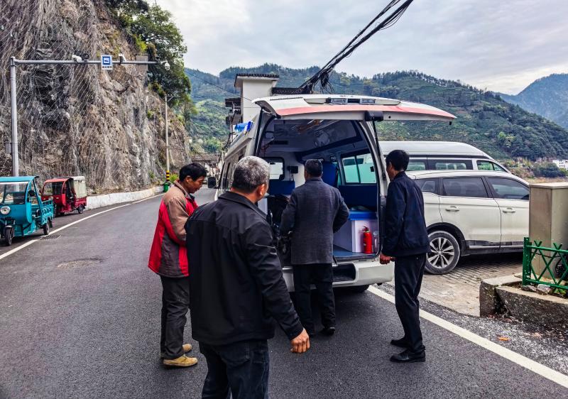 此时,第二棒接力无缝衔接。一辆早已在村道尽头等候的机动三轮车,车厢内铺好了厚厚的棉被。大家齐心协力将老人平稳安置上车,由一名经验丰富的驾驶员驾驶,缓慢驶上老索桥——桥面仅容一辆三轮车勉强通过,驾驶员紧握车把,稳住车速,一寸一寸地向前移动。三轮车颤颤巍巍地驶过悬索桥,稳稳抵达对岸公路。