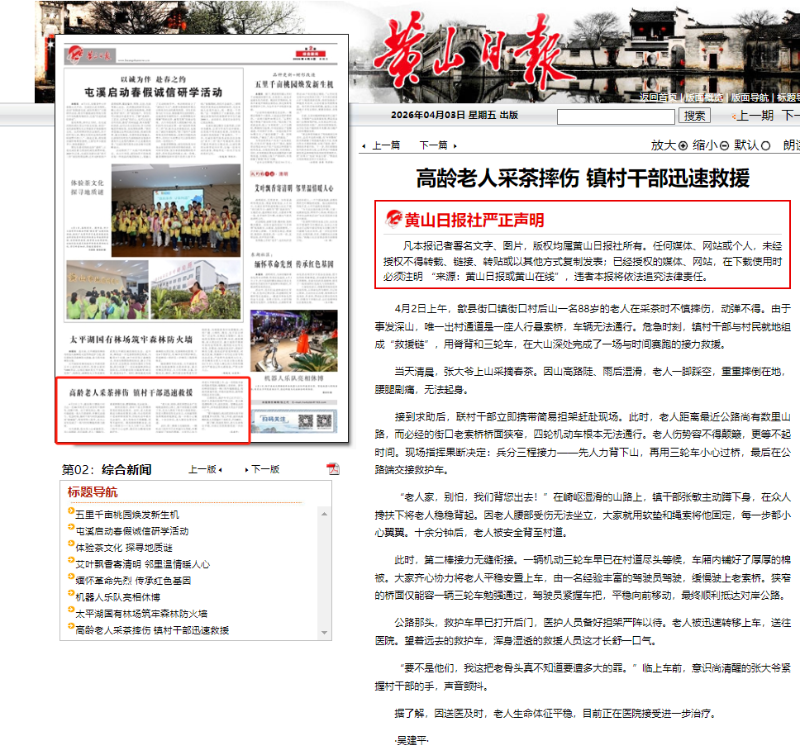 “快来人啊,有人采茶摔了!”4月2日上午,歙县街口镇街口村后山传来一阵急促的呼救声。一名88岁的老人在采茶时不慎摔伤,动弹不得。由于事发深山,唯一出村通道是一座人行悬索桥,车辆无法通行。危急时刻,镇村干部与村民就地组成“救援链”,用脊背和三轮车,在大山深处完成了一场与时间赛跑的接力救援。