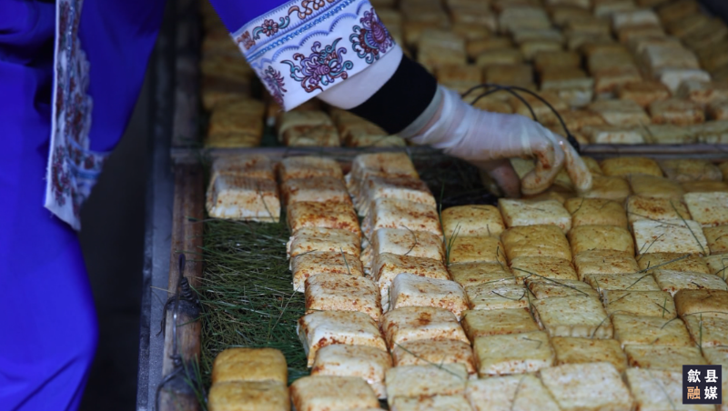 一大早,潘长转就在自家的豆腐坊里忙碌着。泡了整夜的黄豆经过研磨、慢煮、压制等工序,变成了洁白柔嫩的豆腐。做好的白豆腐撒上食盐和辣椒粉,抹一层菜籽油,铺上清香的松针,用炭火进行烘烤,就成了金川乡传统的松针豆腐。