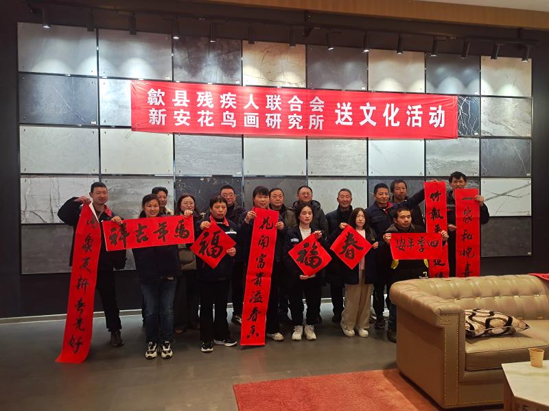 近日,歙县残联联合歙县新安花鸟画研究会前往北岸镇白杨村、黄山运佳装饰材料有限公司开展送春联送祝福活动,为白杨村困难残疾人家庭和运佳公司102名残疾人和企业职工送春联送祝福。