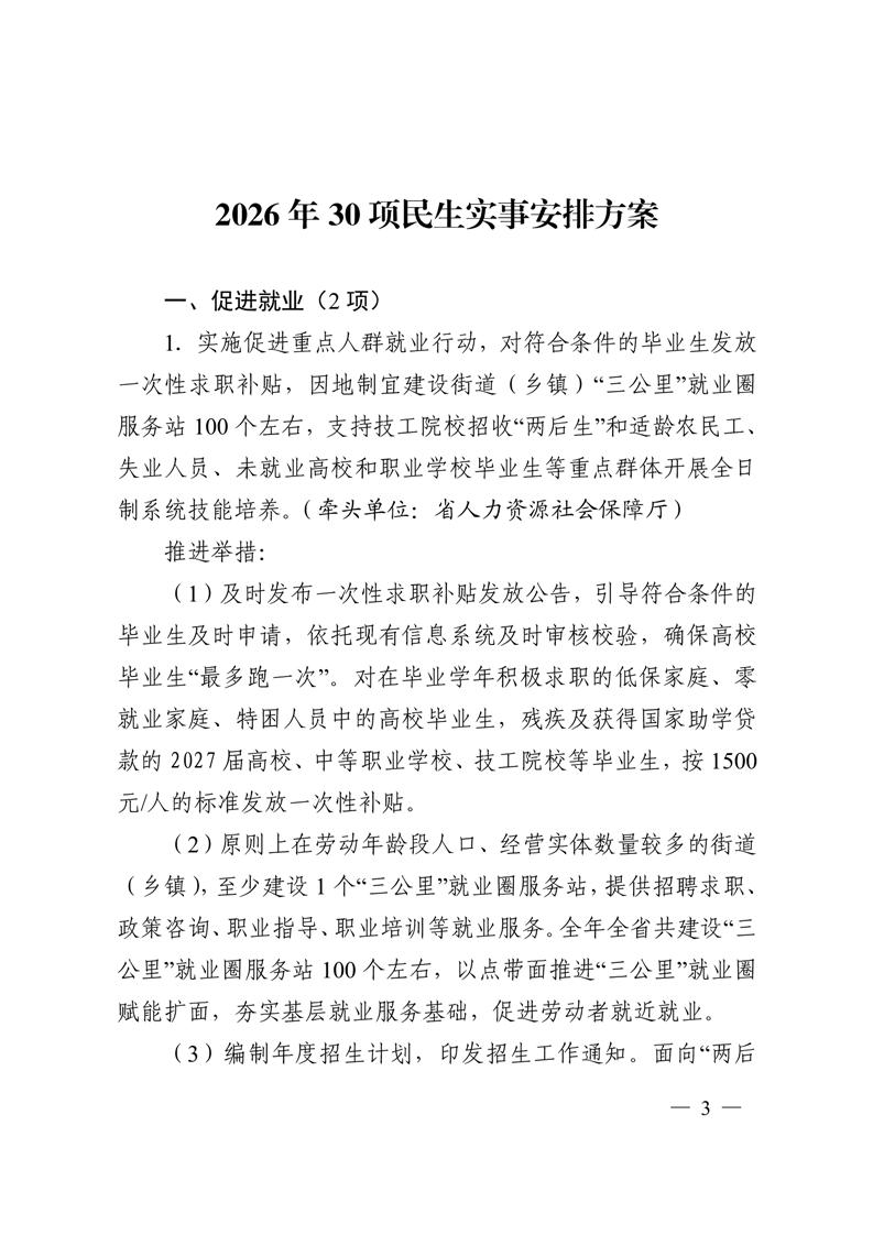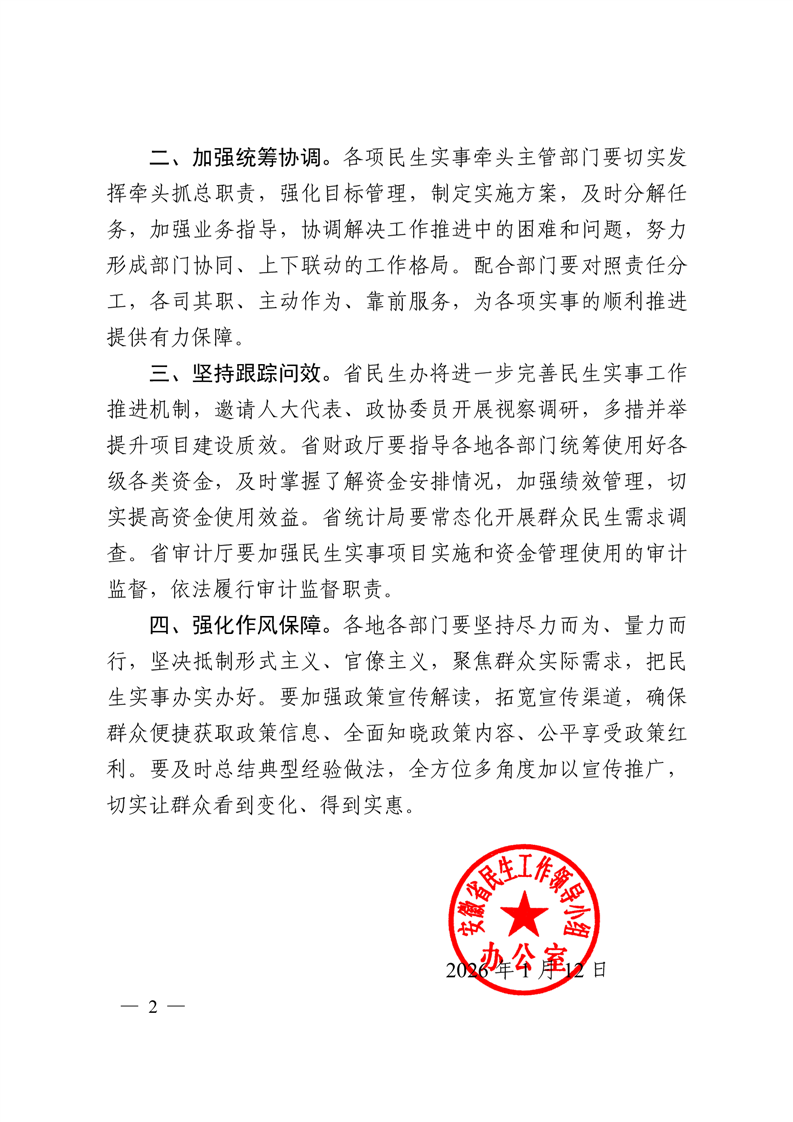 安徽省民生工作领导小组办公室关于印发2026年30项民生实事安排方案的通知