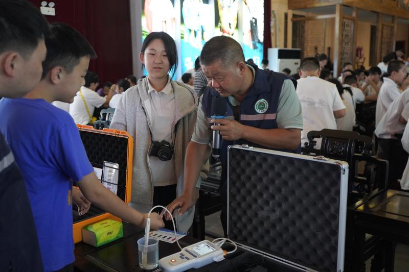 理论学习结束后,学生们化身“小小水质检测员”,在县生态环境分局专家的手把手指导下开启实验环节,运用pH试纸、溶解氧测定仪和便携式氨氮测试包等专业设备测试新安江水样。